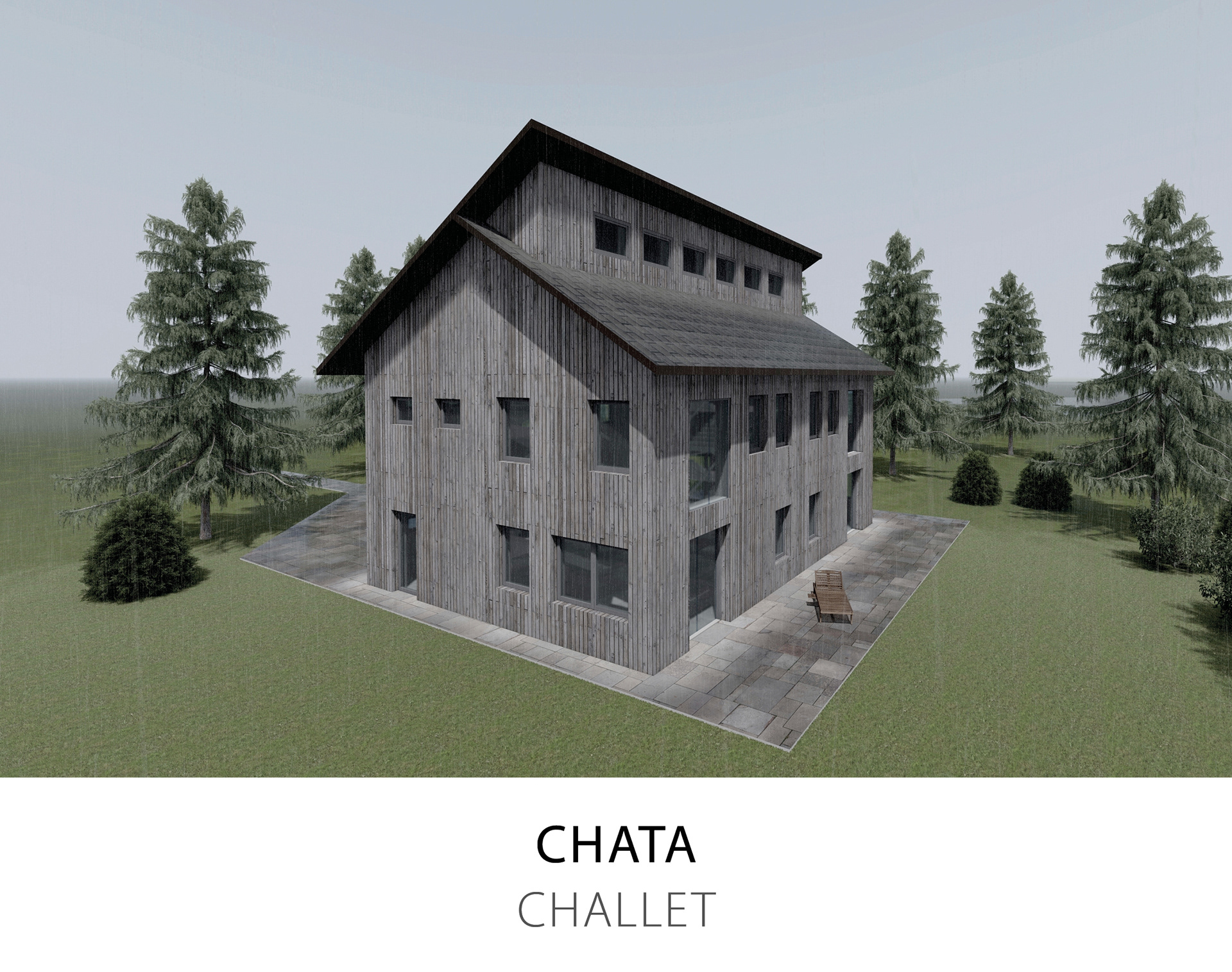 Horská chata o dvou nadzemních podlaží se dvěma byty, sedlovou střechou a střešními světlíky, které umožňují využití zastřešené části objektu jako plnohodnotného obytného podkroví nebo galerii.