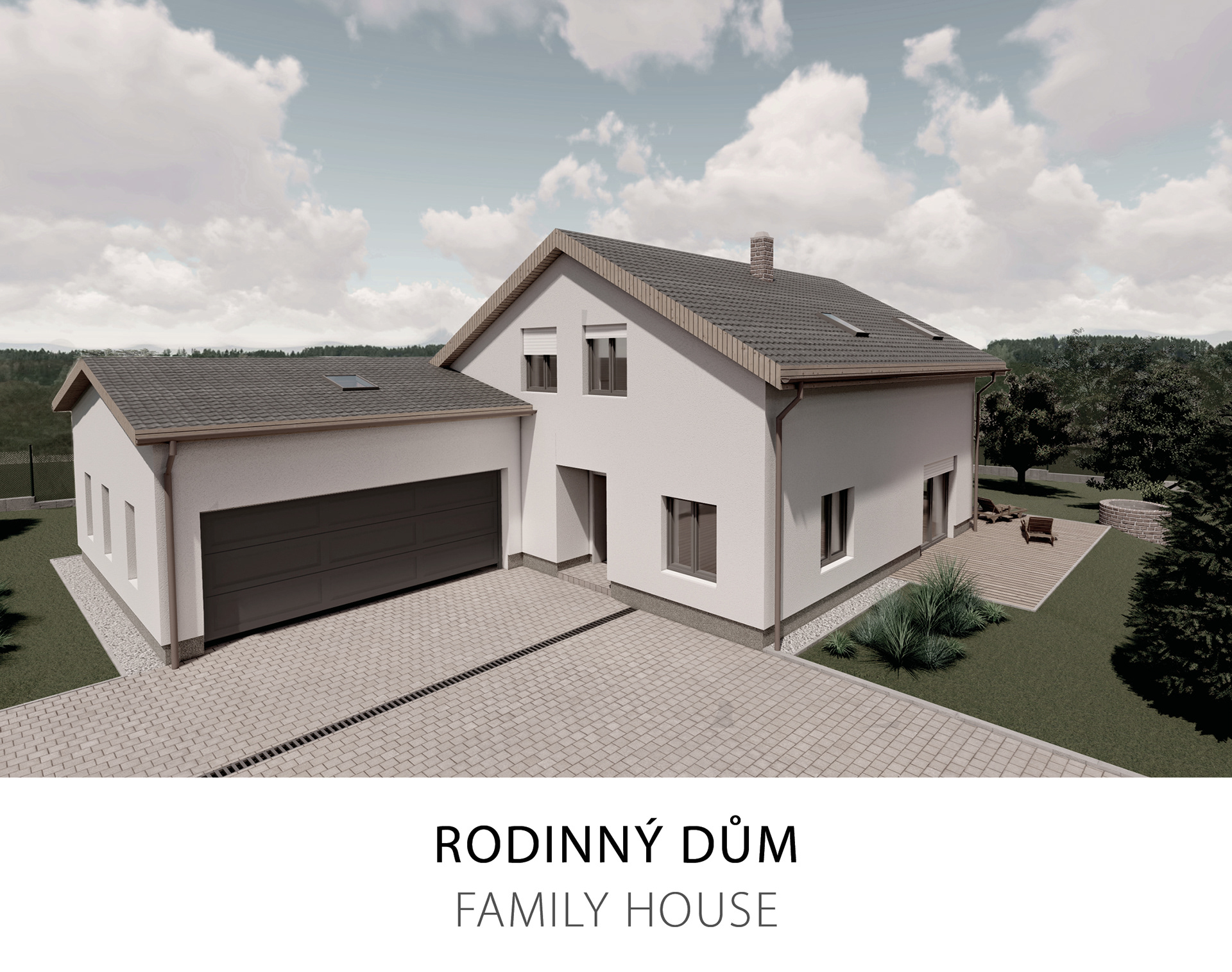Vizualizace již navrženého dvoupatrového rodinného domu se sedlovou střechou, s garáží a zahradou pro soukromého investora.