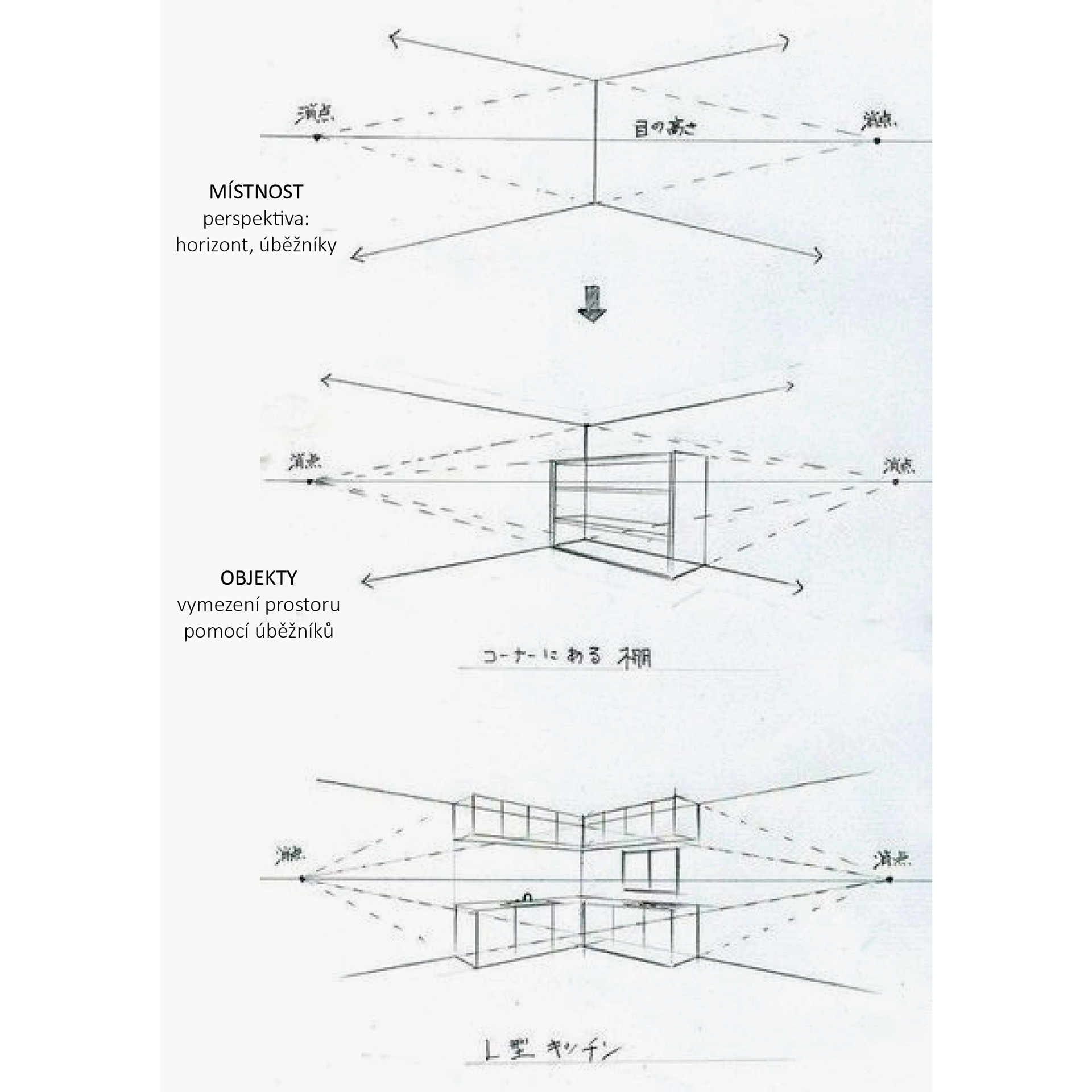 Teoretický postup: dvoubodová perspektiva: pro představu postupu práce se jedná o bodové vytýčení prostoru, dvěma body. Prakticky se Vám tyto body na výkres nevlezou, ale potřeba na ně myslet a pomyslně s nimi počítat. Pro lepší představu lze používat například špejli a průběžně styčné body kontrolovat, aby se Vám všechny čáry v perspektivě pomyslně sbíhaly, čímž si pojistíte věrohodnost kresby a zobrazení prostoru. Lze tak použít pomocné papíry, kterými zvětšíte výkres (přiložením pomocného papíru na stranu výkresu zleva a zprava), kde si tyto body můžete stanovit.