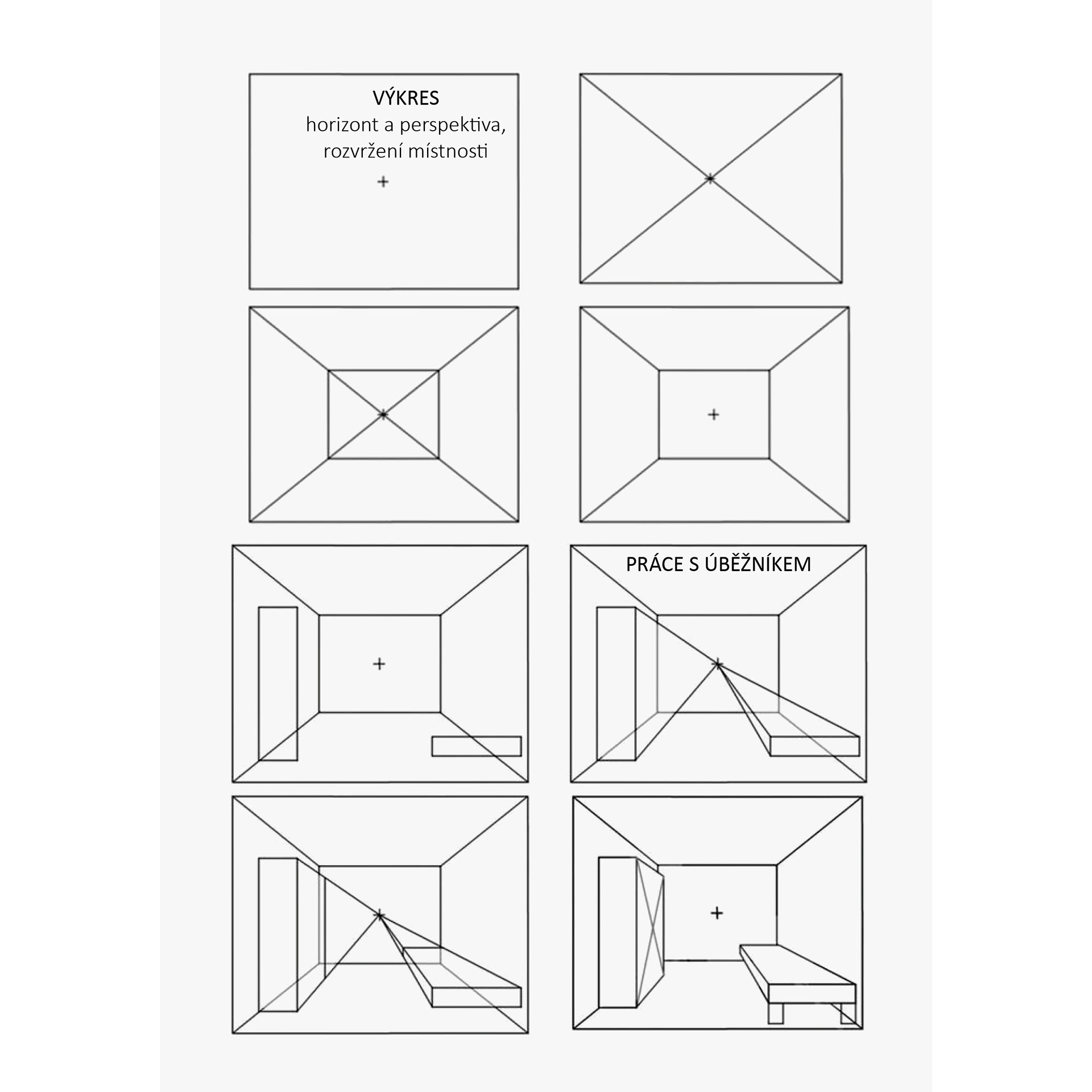 a) začněte odměřováním pomocí tužky nebo špejle, vymezte horizont a úběžník(y), nezapomeňte na střed výkresu (kresba by měla vyplnit formát)