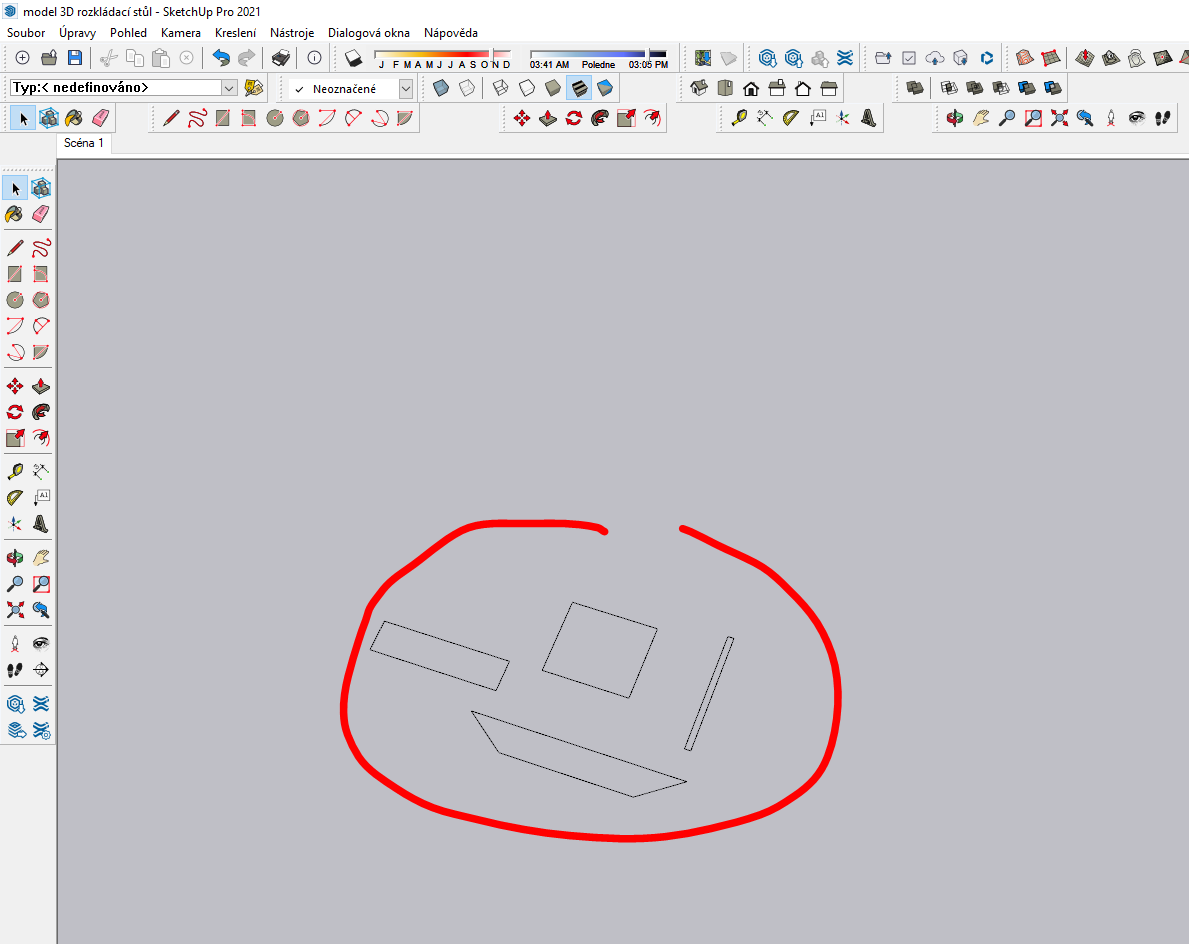 - pomocí nástroje pro vytažení lže plochy vytáhnout do požadovaného objemu (tloušťky, hloubky atd.), dále je potřeba díly trojklikem spojit do skupiny (komponenty) a vytvořit jeden díl > pak lze skupinu (komponenty) snadněji přemisťovat a poskládat dle potřeby do modelu (např. stolu)