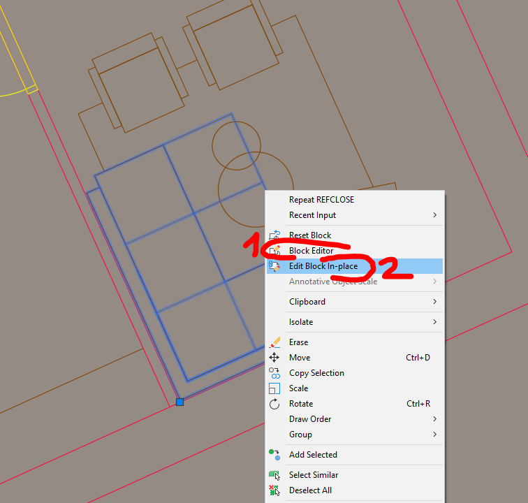 - možnost duruhá - lze přímo v modelovém prostoru (potlačí úpravy na pozadí a přenese do editace bloku přímo v modelu), dobré pro rychlé úpravy. Ukončení vpravo nahoře - uložit (nebo zahodit změny, pokud blok nechcete upravit)