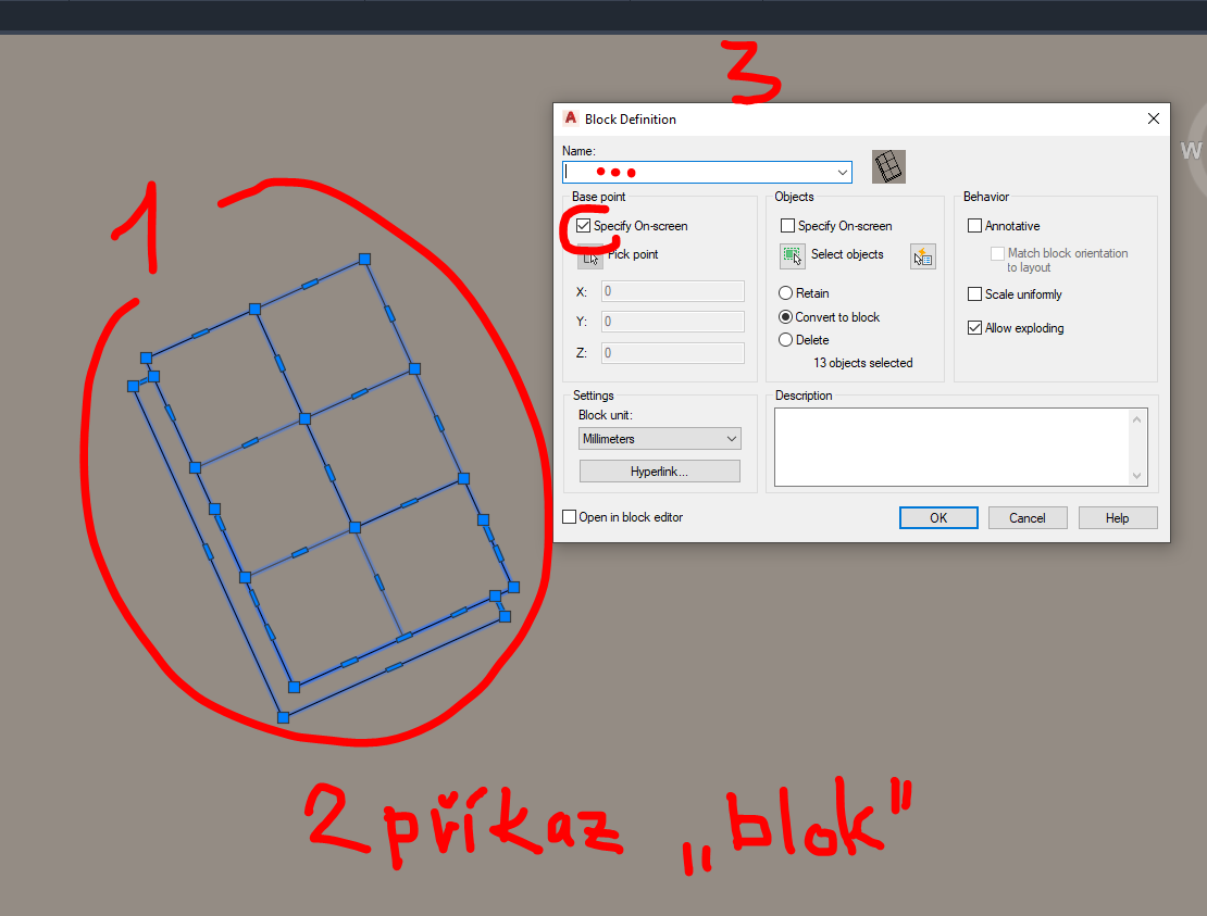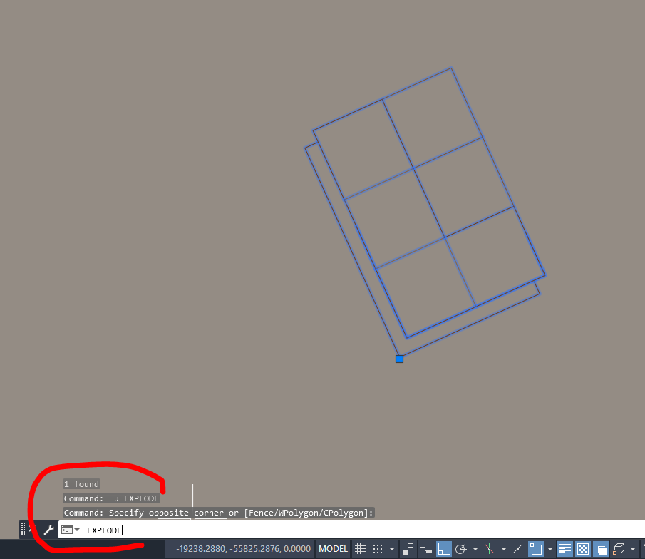 - rozbije blok na objekty (čáry, kružnice atd., podle toho, co obsahuje) a objekty se stanou součástí modelového prostoru (lze opět vrátit zpět přes ctrl+Z)