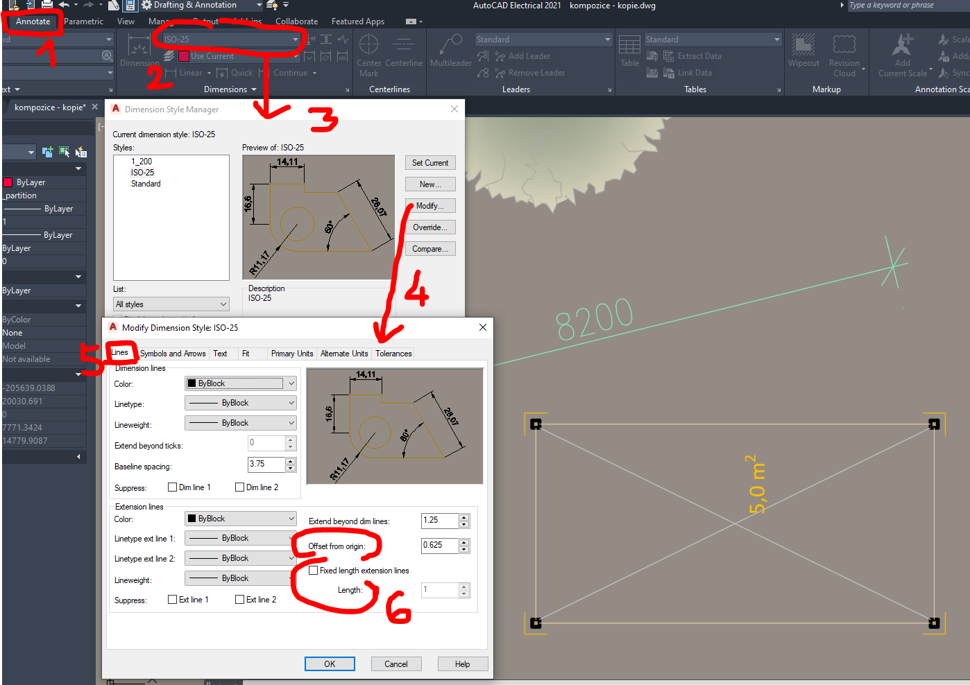 - dále přes pás karet > Annotate (3. karta v horní liště) > rozbalit šipečkou > kliknout na Manage dimension style (správce kótovacích stylů či tak nějak v češtině) > rozbalí se dialogové okno > vybrat kótovací styl > Modify (Upravit) > otevře další dialogové okno