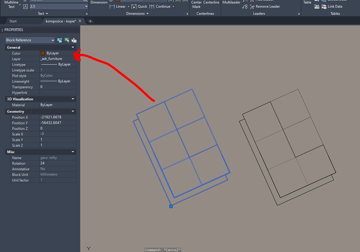 čáry a bloky - ideální je mít čáry pro blok v hladině 0 (úplně vždy) a až pak po uložení bloku přenést blok do jiné hladiny... protože takto když se vypne hladina (například _adr_furniture, vypne se i tento blok), pro úpravu objektů v bloku platí všechny možnosti úprav přes vlastnosti (například upravit typ čáry, tloušťku apod., lze ji také upravit přes blok, lze i nastavit, aby se blok choval odlišně - ukážeme si na další hodině, jak lze pracovat s blokem a co lze nastavit)