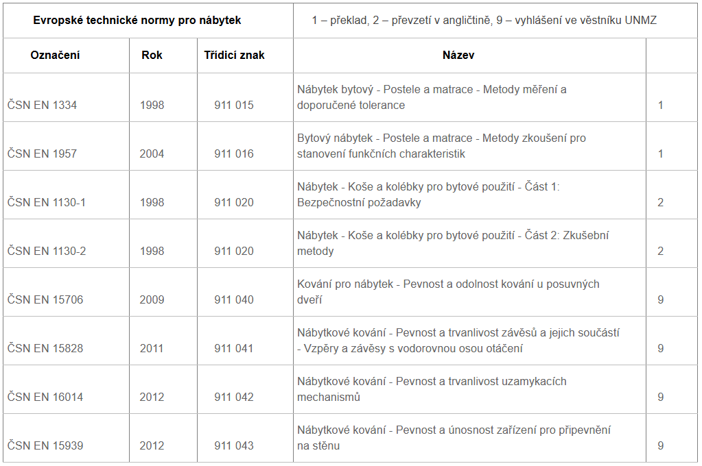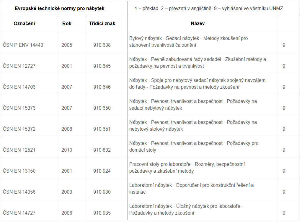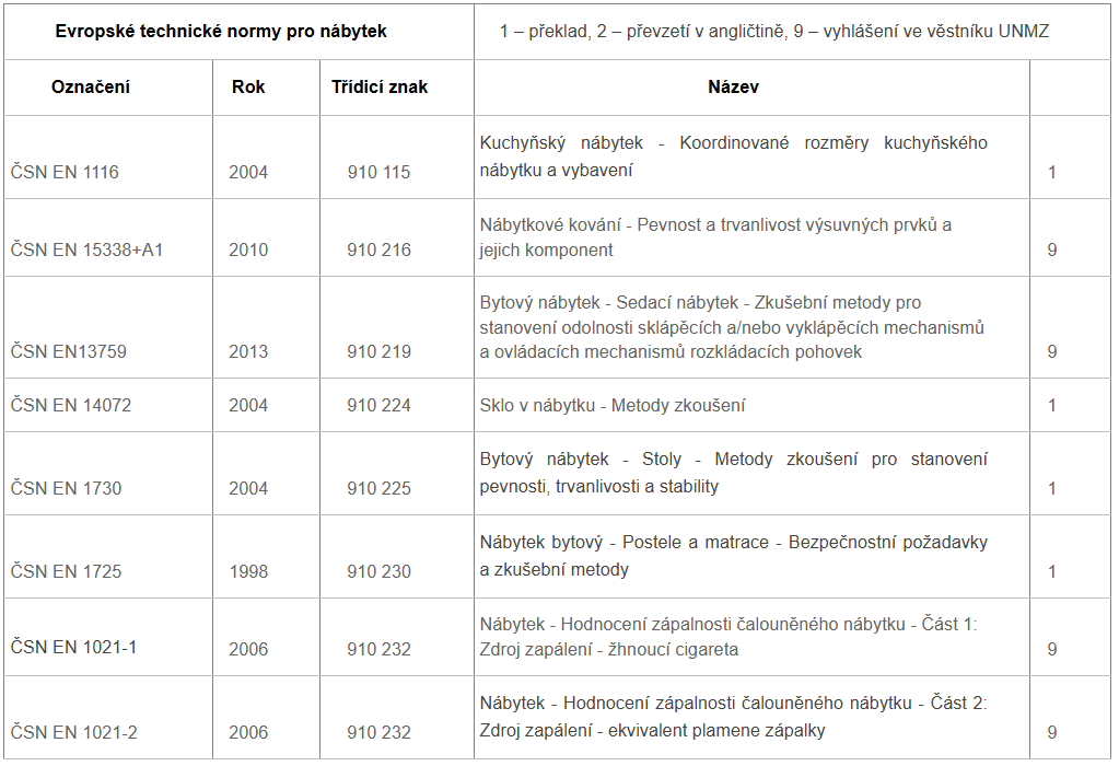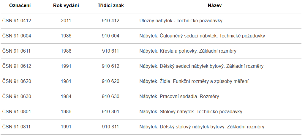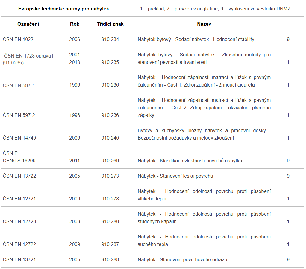 České technické normy platné pro nábytek: