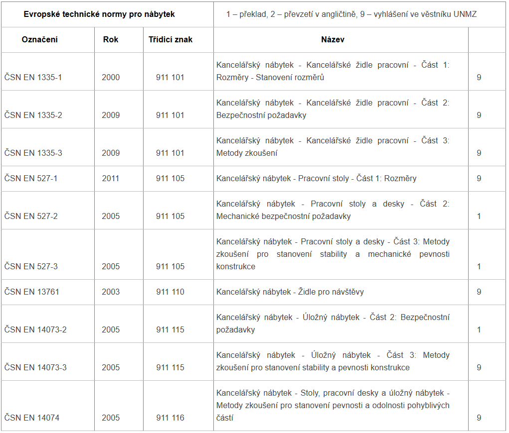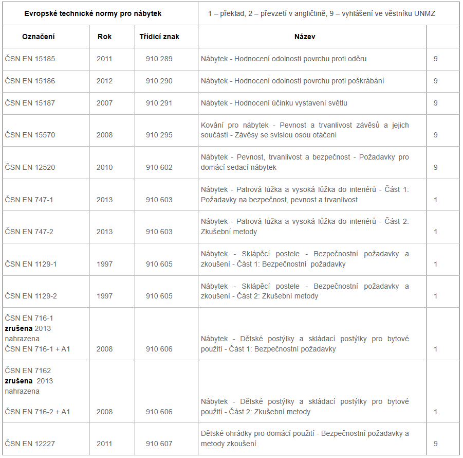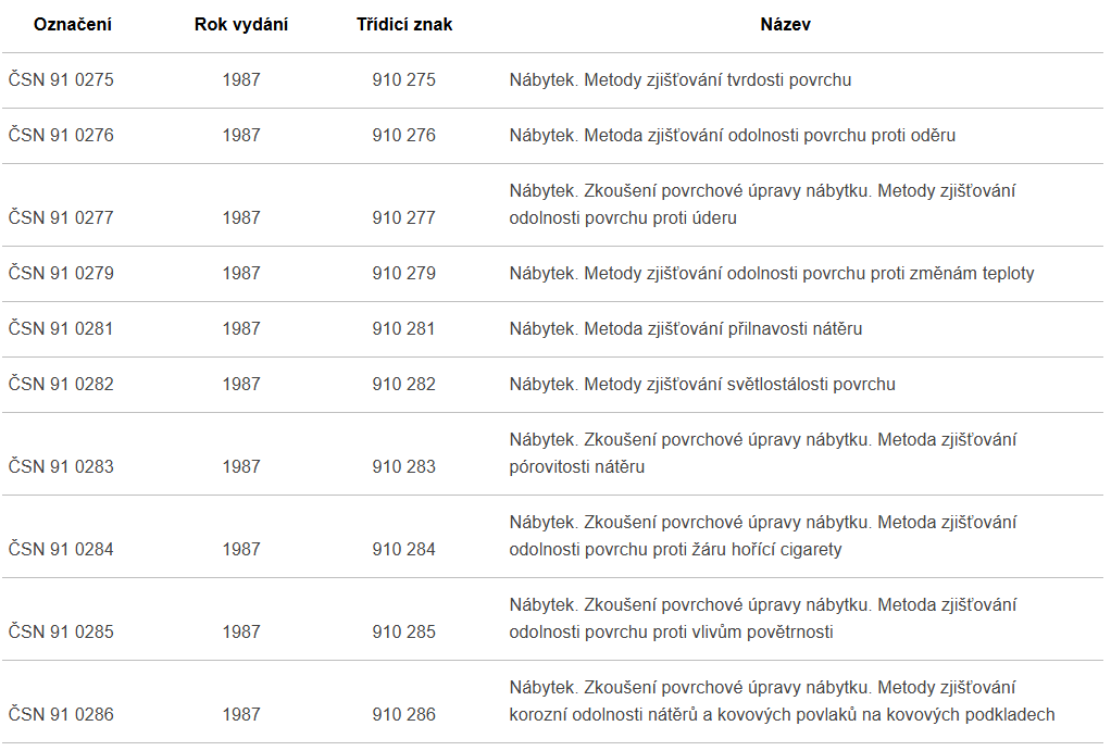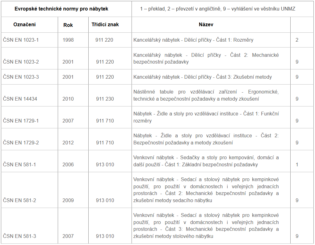 České technické normy platné pro nábytek: