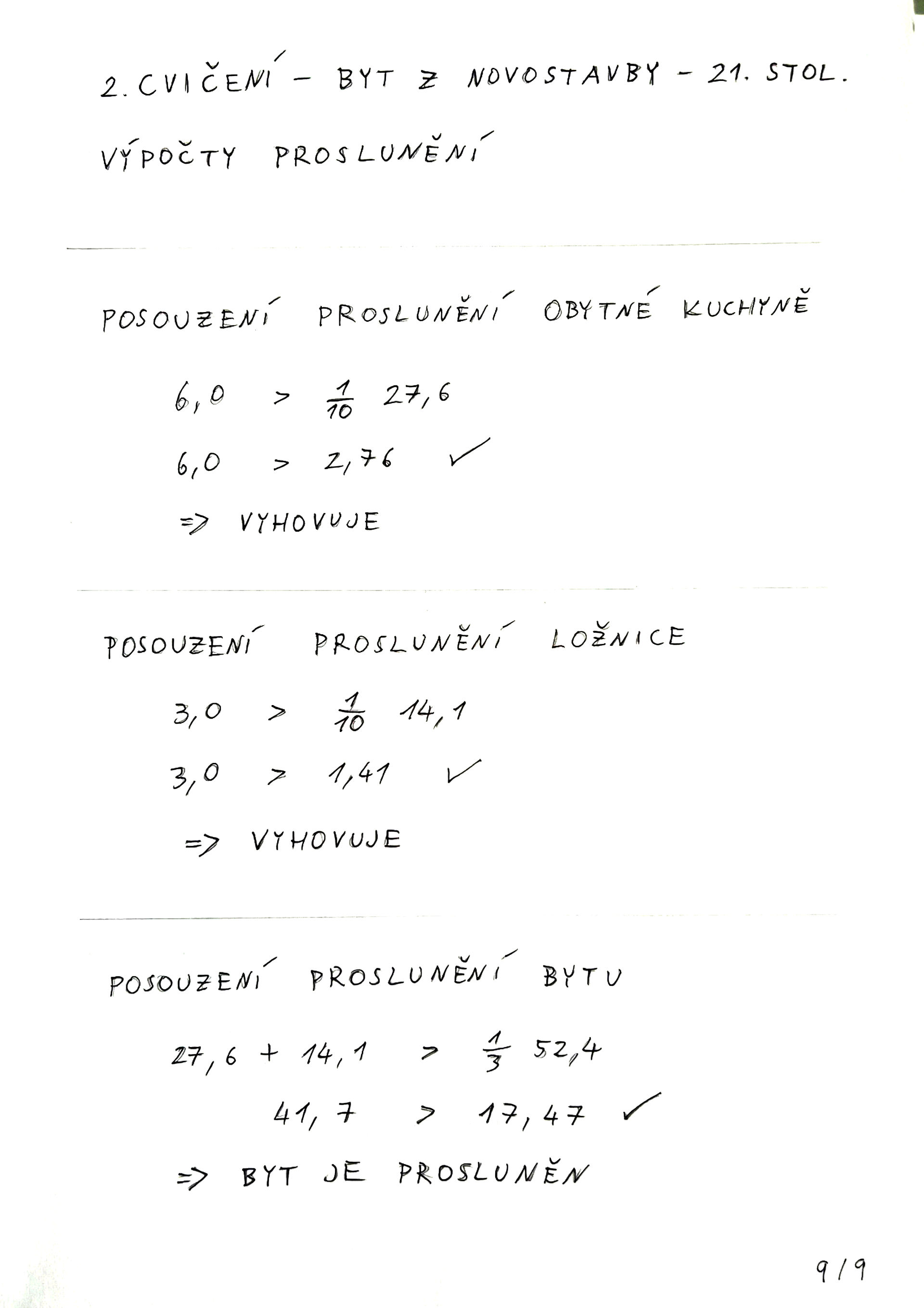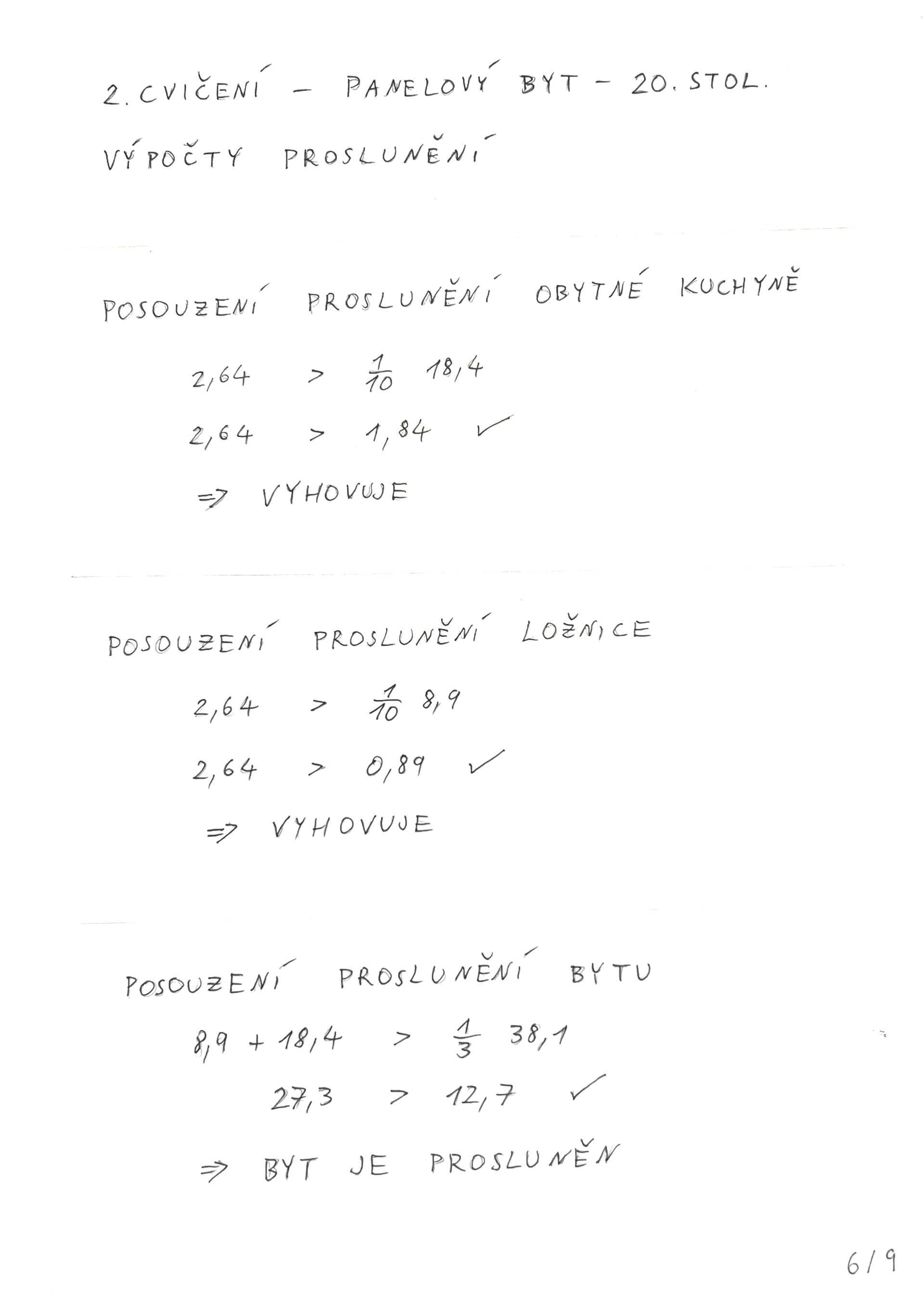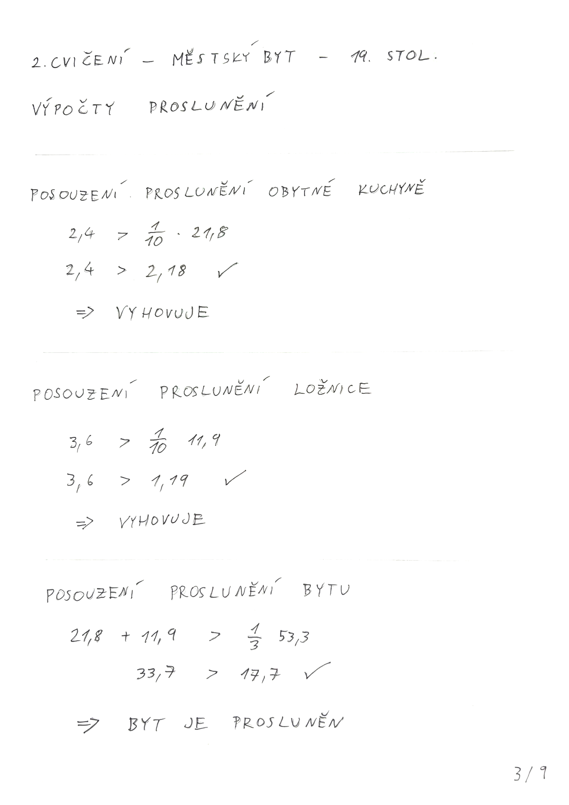 e) Samostatně - výpočet proslunění bytu (ověřeno výpočtem - byt je prosluněn je-li součet ploch posuzovaných obytných místností > 1/3 plochy všech obytných místností posuzovaného bytu; obytná místnost je prosluněna je-li součet plochy okenních otvorů posuzované obytné místnosti > 1/10 plochy této posuzované obytné místnosti; pozn. za obytnou místnost je považována místnost, jejíž výměra musí mít plochu nejméně 8 m2)
