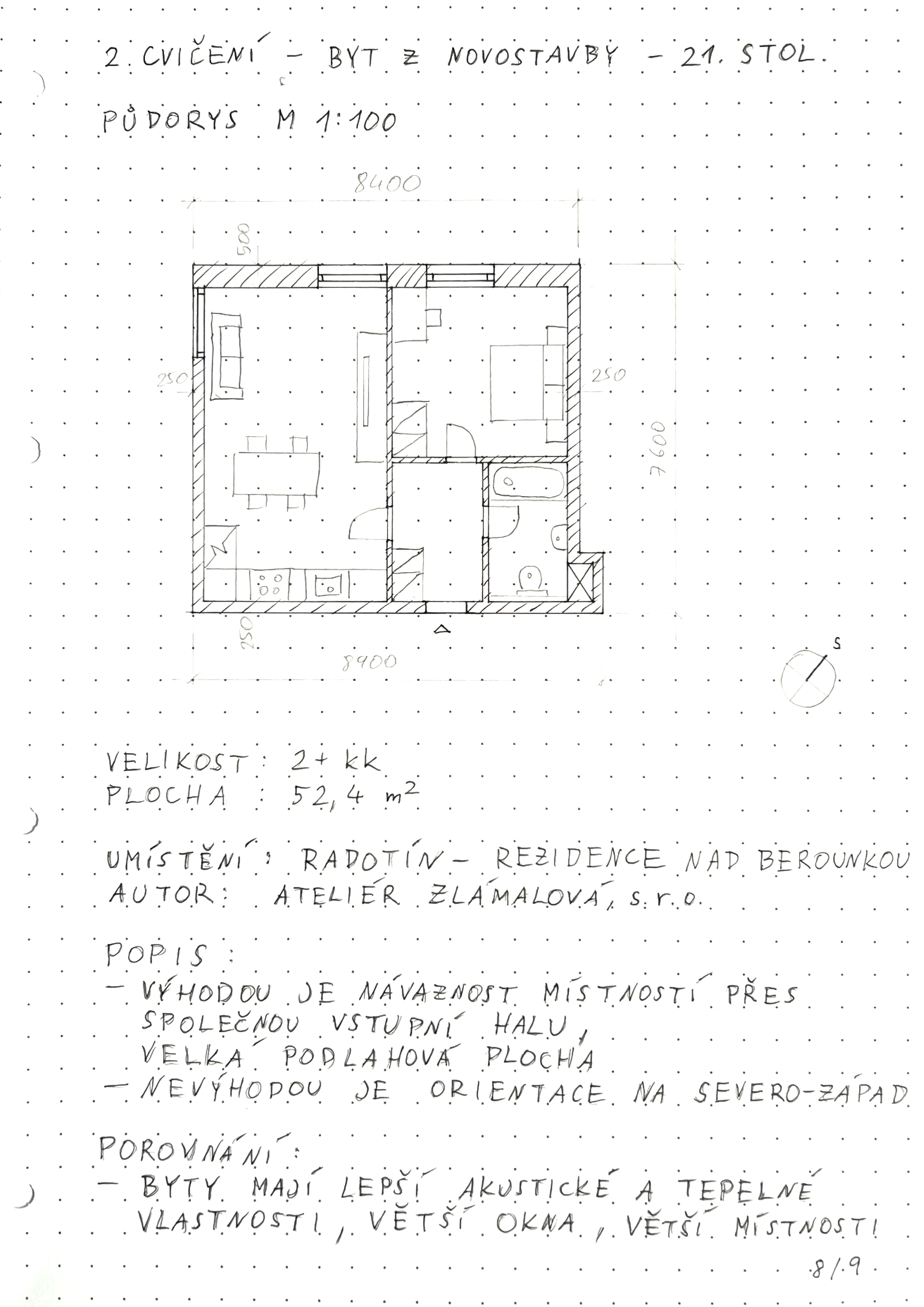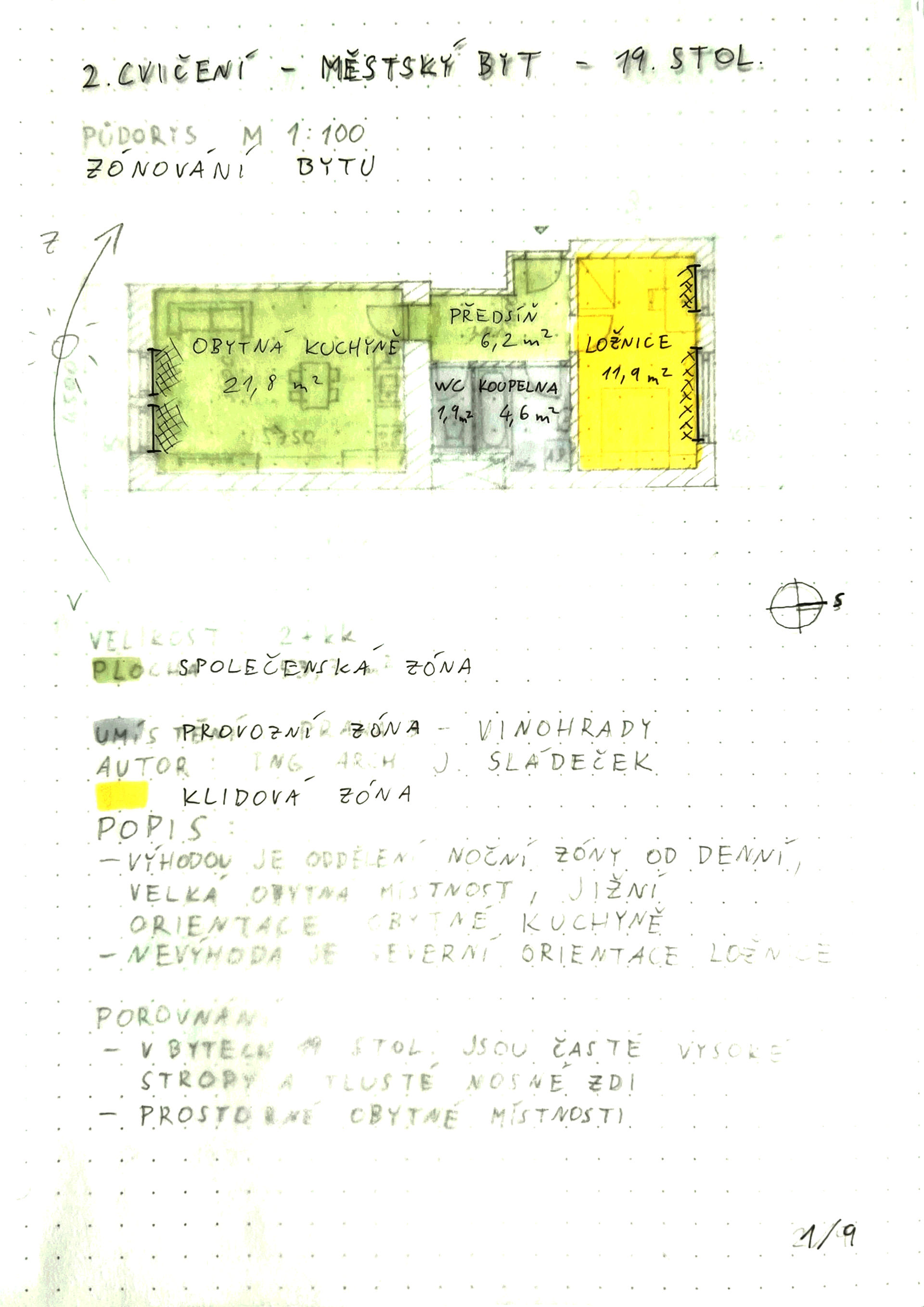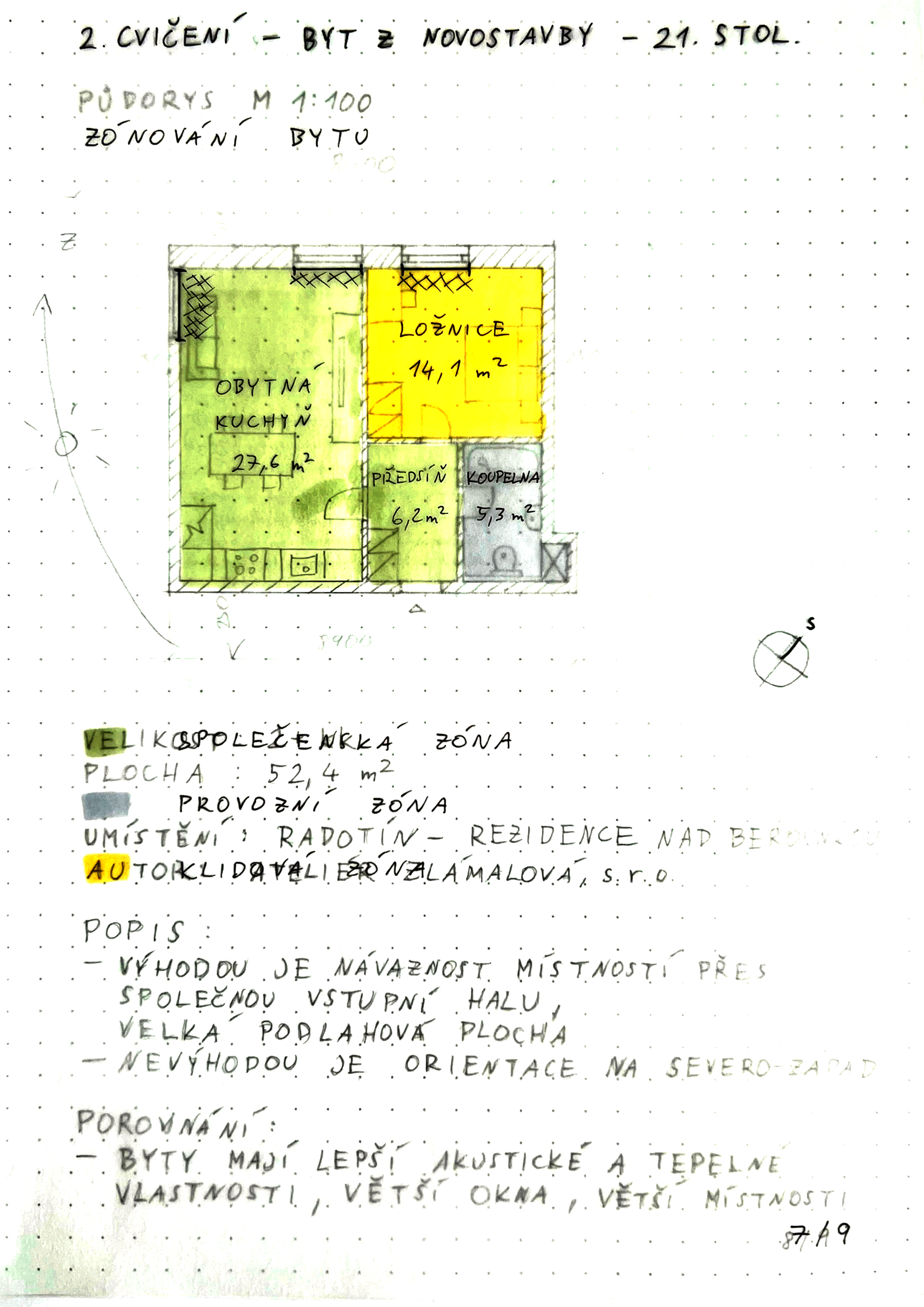 b) Vyznačení na průsvitném papíře - zónování bytu (barevně), označení vstupu do bytu, vynesení konstrukcí (rozlište druhy konstrukce tl. čáry nebo použijte šrafy - vystačí jeden druh) a popis konstrukčního systému (příčný, podélný, obousměrný nosný stěnový systém, skelet...)