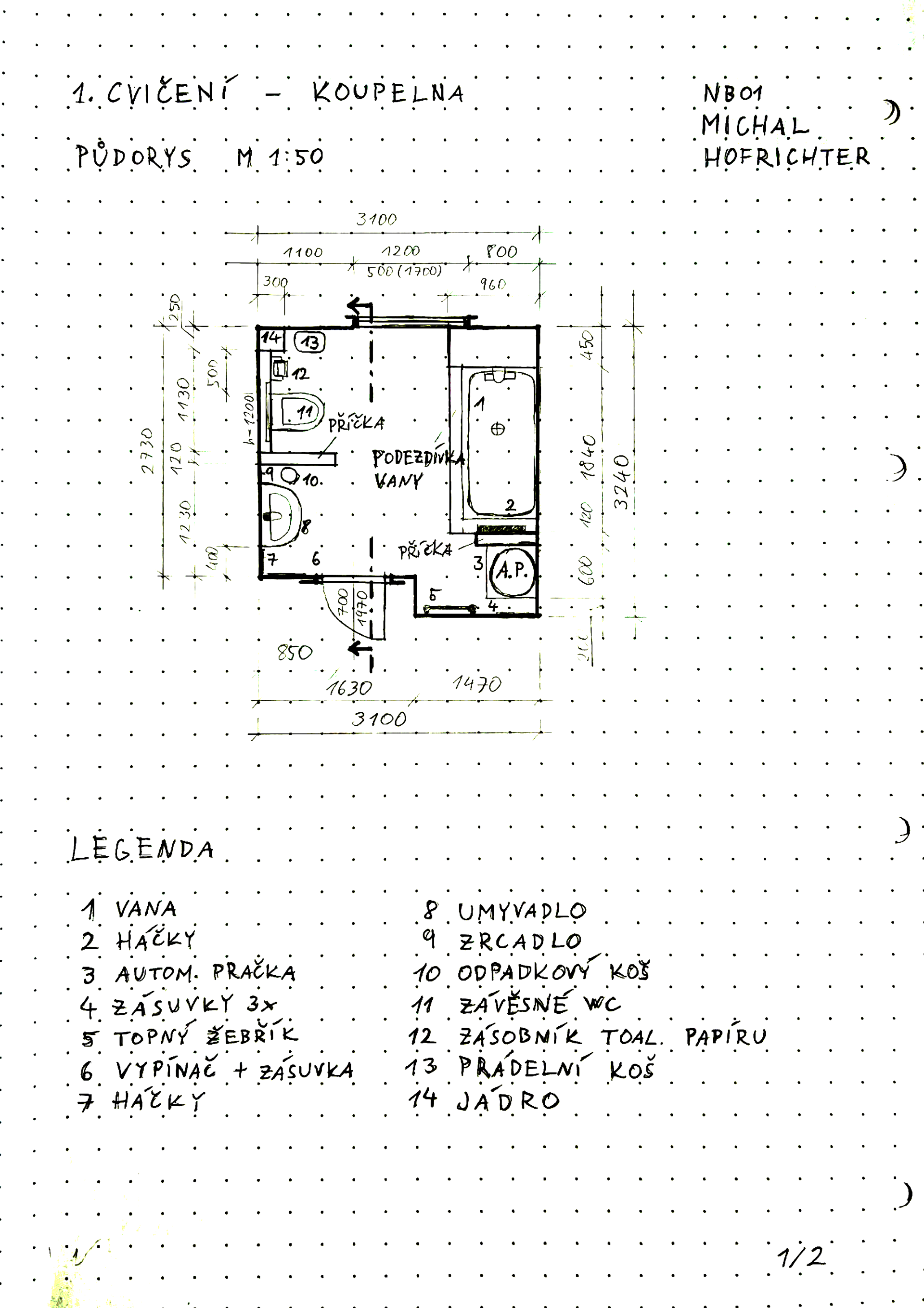 Úloha je zaměřena na osvojení si základních rozměrů a funkčních návazností bytu se zaměřením na dispoziční řešení koupelen (formou vlastního návrhu). Seznámení se s podrobnostmi jednotlivých zařizovacích předmětů a jejich značením v půdorysech. Dále si student zadáním osvojí základní rozměry potřebné k návrhu koupelen, návaznosti na soukromé části bytu a jejich uplatnění.