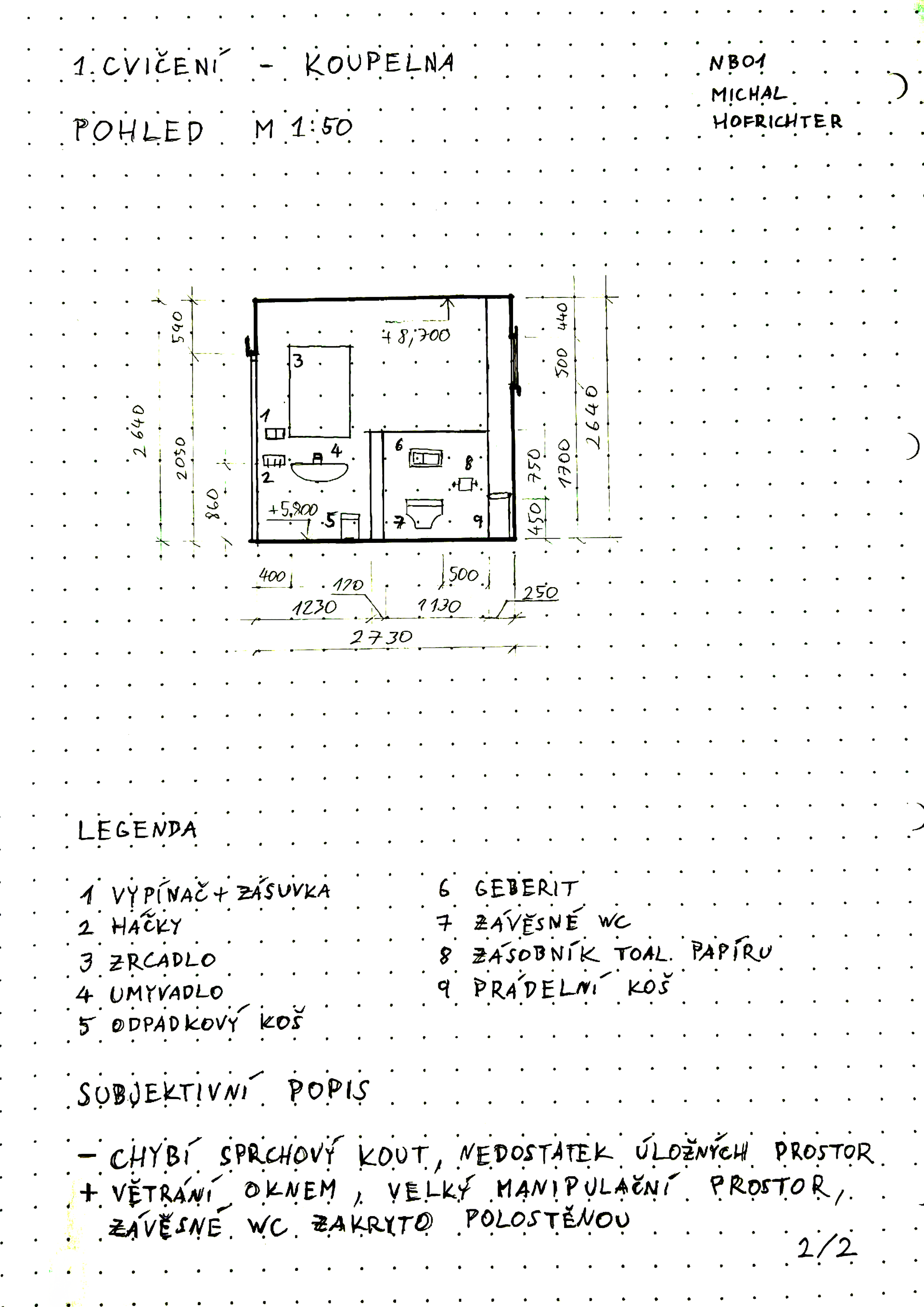 b) Ve výkresech budou okótovány zařizovací předměty (umyvadlo, toaleta na osu ke konstrukci) a základní odstupy (kóty pro průchody, základních rozměrů místnosti, zařizovacích předmětů apod.), označení vedení pohledu v půdorysu