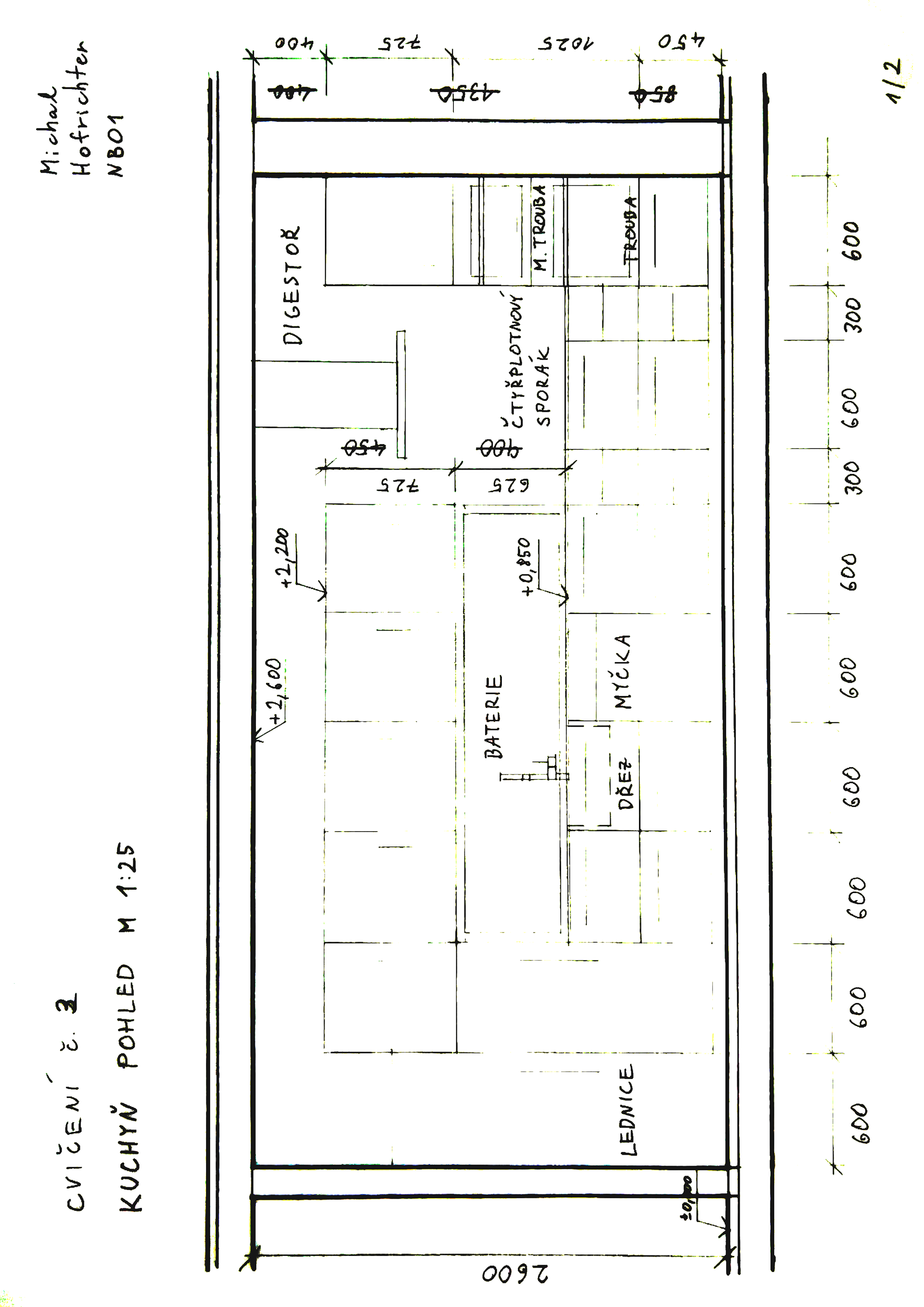 b) Ve výkresech budou umístěny zařizovací předměty a základní odstupy (kóty pro průchody, základních rozměrů místnosti, zařizovacích předmětů apod.), označení pohledu v půdorysu, rozlišením druhu čar řešení grafického zobrazení horních skříněk