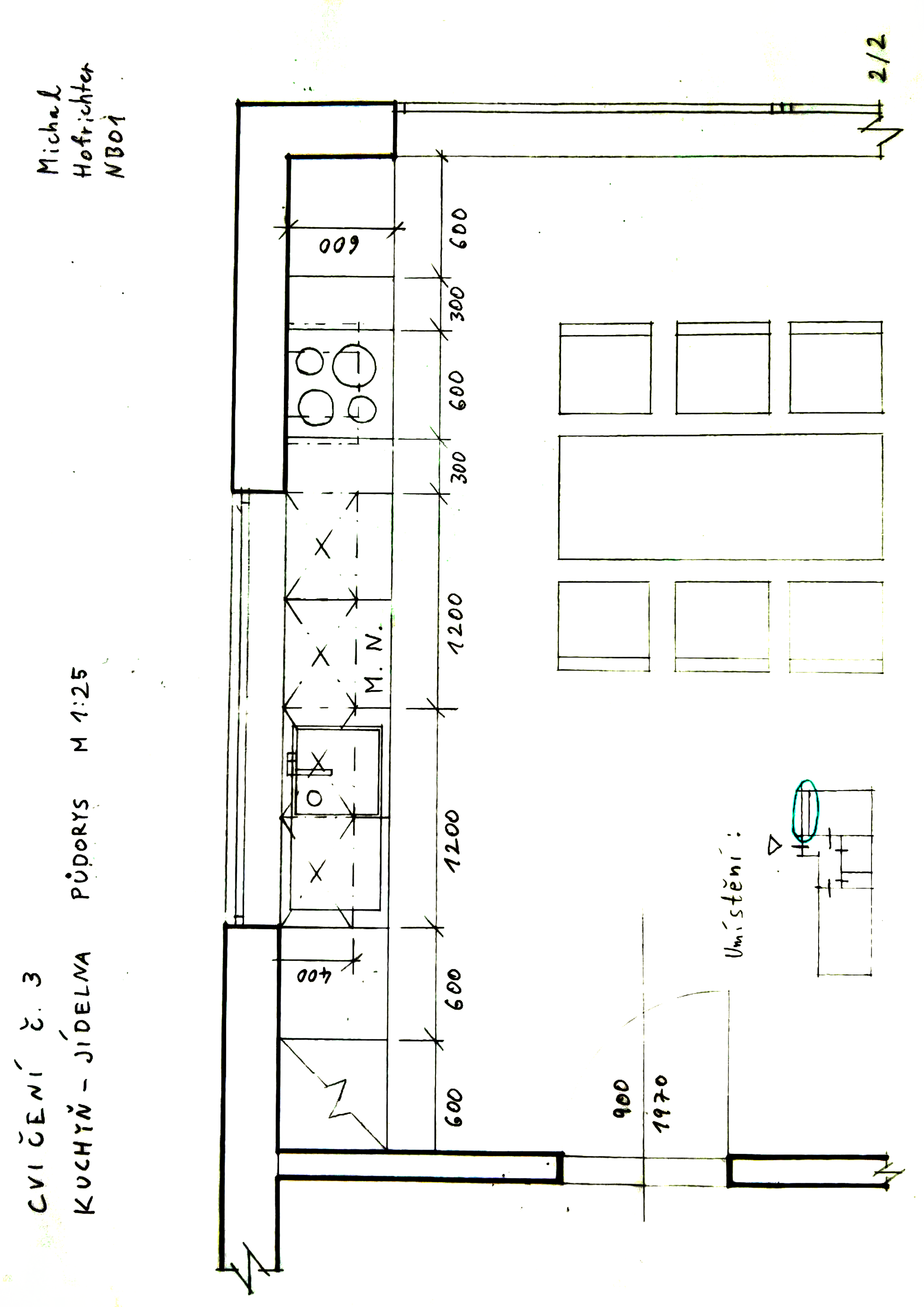 Úloha je zaměřena na osvojení základních rozměrů a funkčních parametrů při práci a pobytu v kuchyni vlastním návrhem. Seznámení s podrobnostmi zařizovacích předmětů a jejich značení v půdorysech.