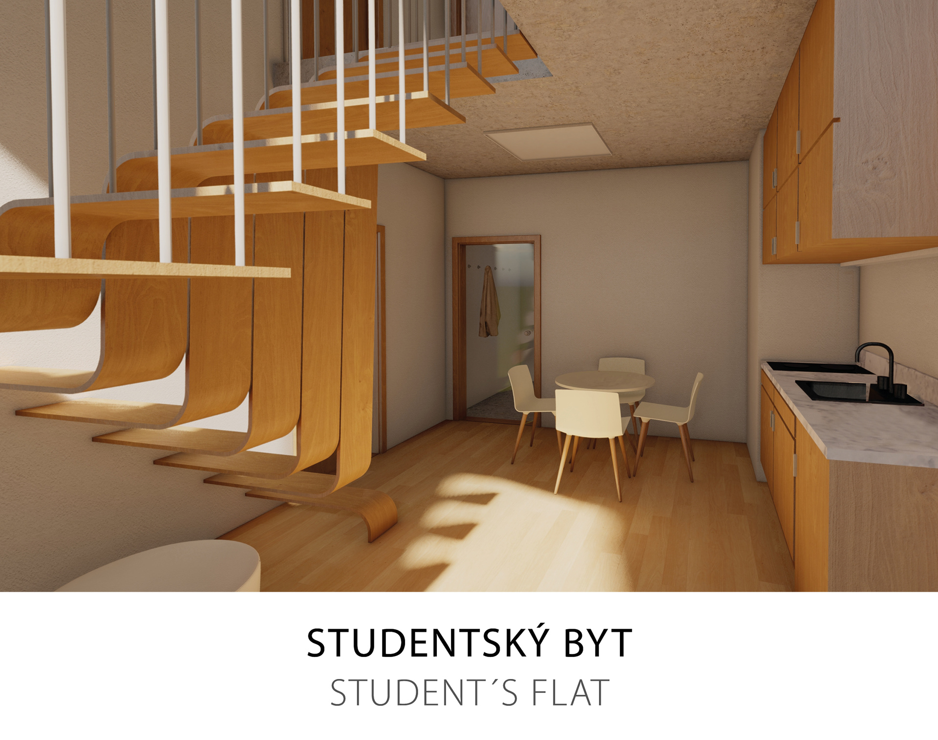 The apartment for up to six students is designed over two floors as a loft with a balcony and a designer staircase in the interior with a large French window on the facade. It contains three bedrooms, two bathrooms and a lounge.