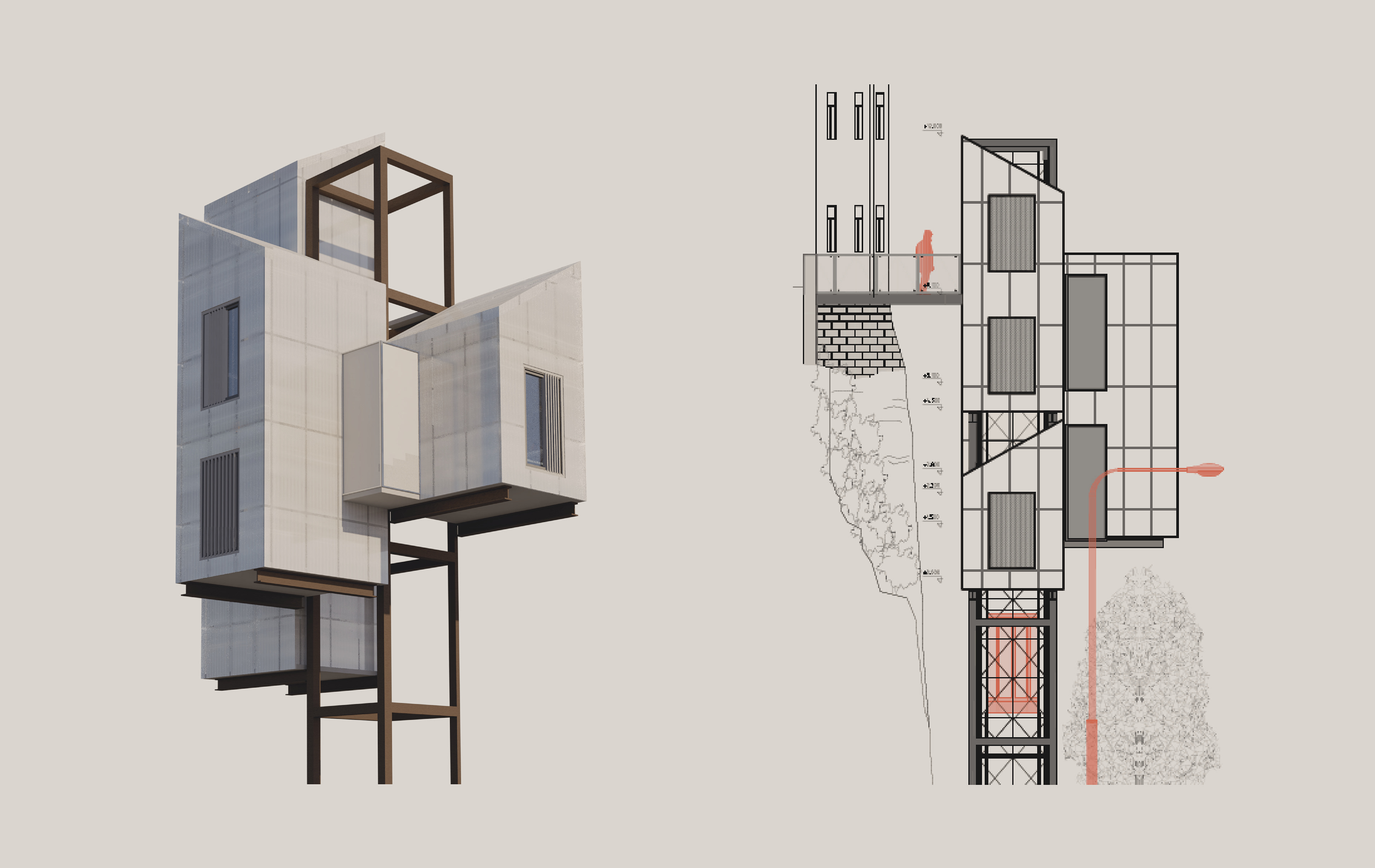 Objekt zavěšený na výtahu obklopuje tubus výtahové šachty. Nezabírá žádný prostor na zemi a maximálně využívá minimální prostory. Materiál fasády z polykarbonátu propůjčuje fasádě světelný efekt v nočních hodinách.